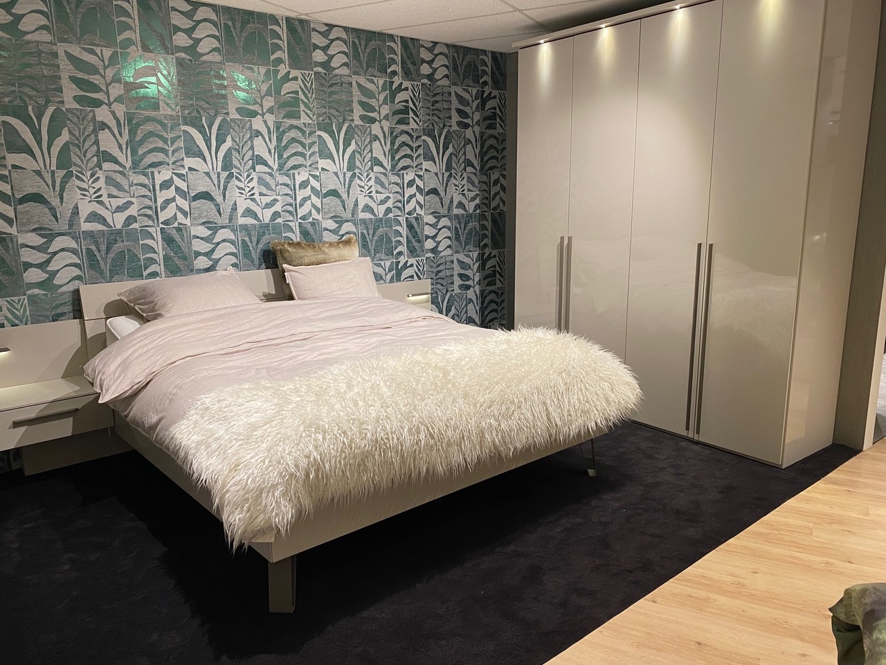 Hoogglans lichtgrijze slaapkamer direct uit toonzaal leverbaar.